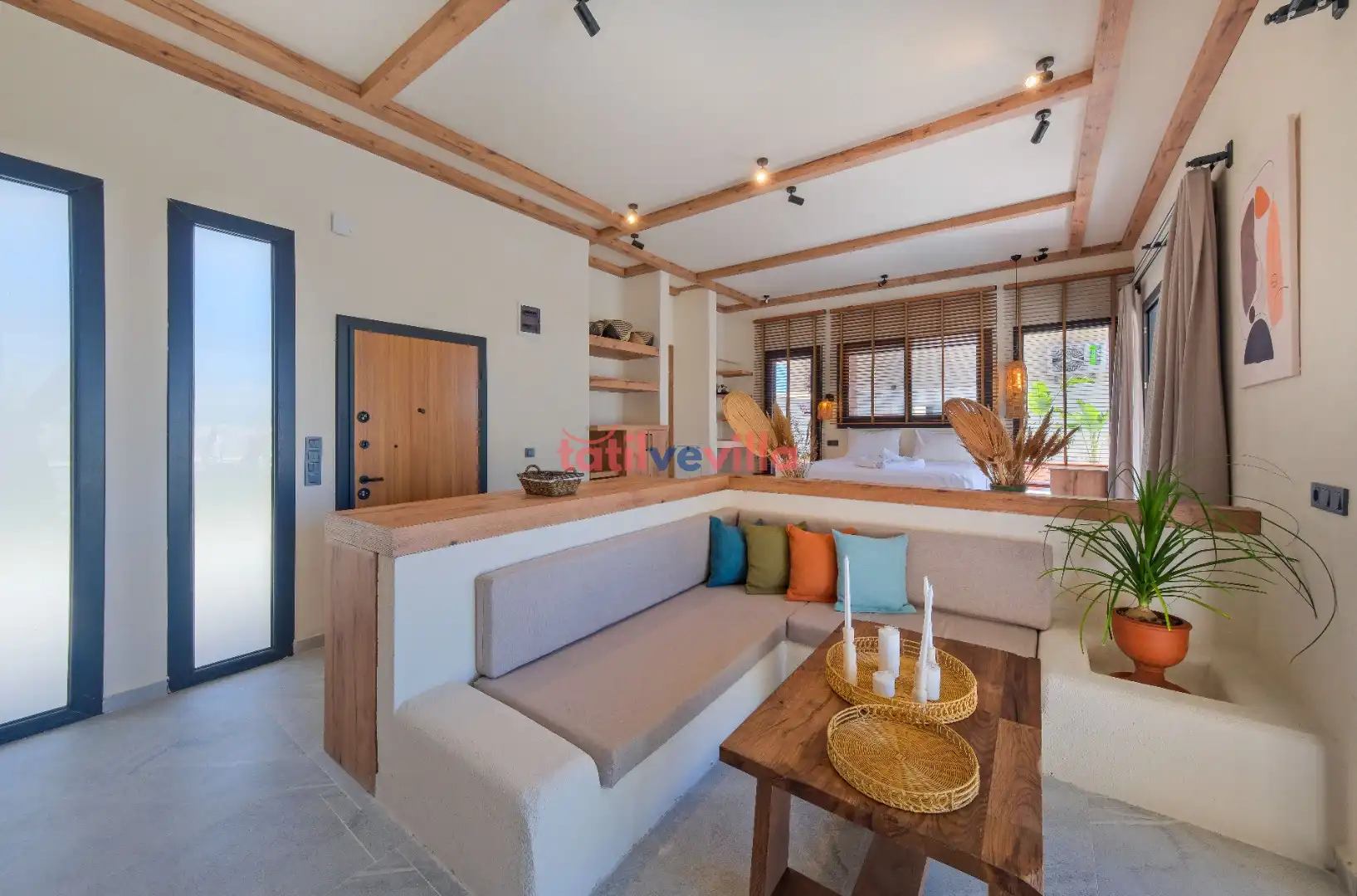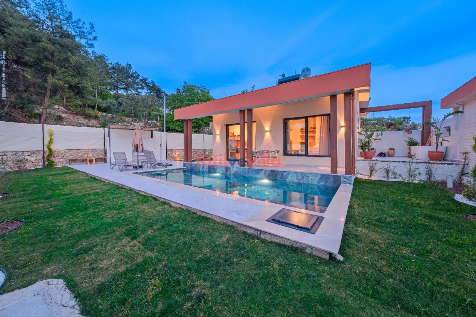 Modern ve sade çizgilerin hakim olduğu iç mekan tasarımı ile tatilinize farklı bir hava katmayı planlayan villa bahçe ve havuz alanı ile sadece size özel bir tatil vadetmektedir. Sevdikleriniz ve aileniz ile keyifle vakit geçirebileceğiniz özenle tasarlanmış iç ve dış mekanları, güneşin ve temiz havanın tadına doyacağınız havuz ve bahçe alanı ile ayrıcalıklı tatilin kapılarını sizlere aralıyor. Aynı zamanda şehir kargaşasından uzak, sakin bir tatil arayan misafirlerimiz için unutulmaz bir fırsat sunmakta olan villanın bahçe ve havuz terasında kapasiteye uygun şezlong takımı, oturma grubu, barbekü alanı ve salıncak bulunmaktadır. Havuz terasına açılan ihtiyaçlarınıza karşılık verecek konforlu oturma odası, tam donanımlı açık mutfağı; yatak odasında çift kişilik yatak ve ebeveyn banyosu bulunmaktadır.