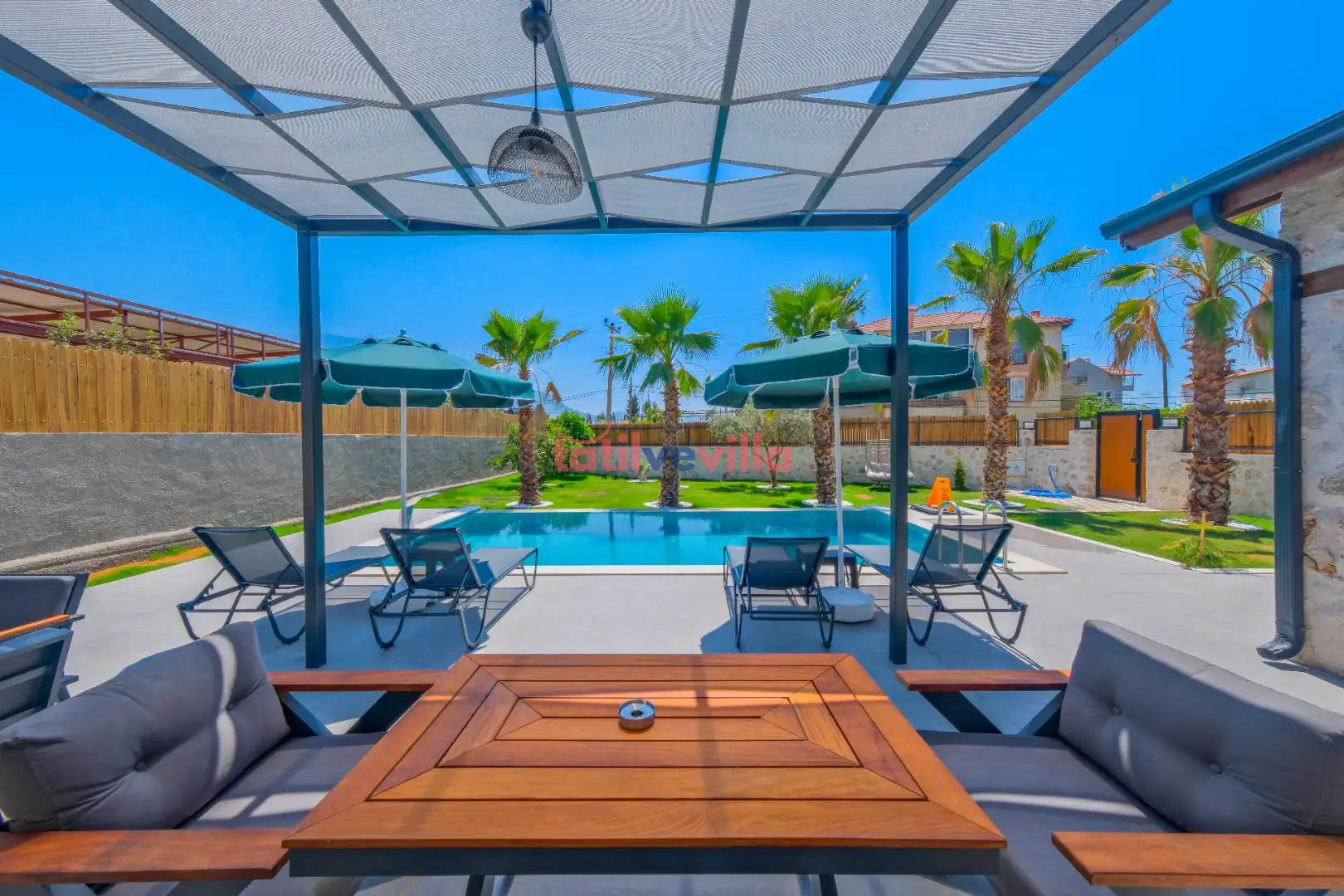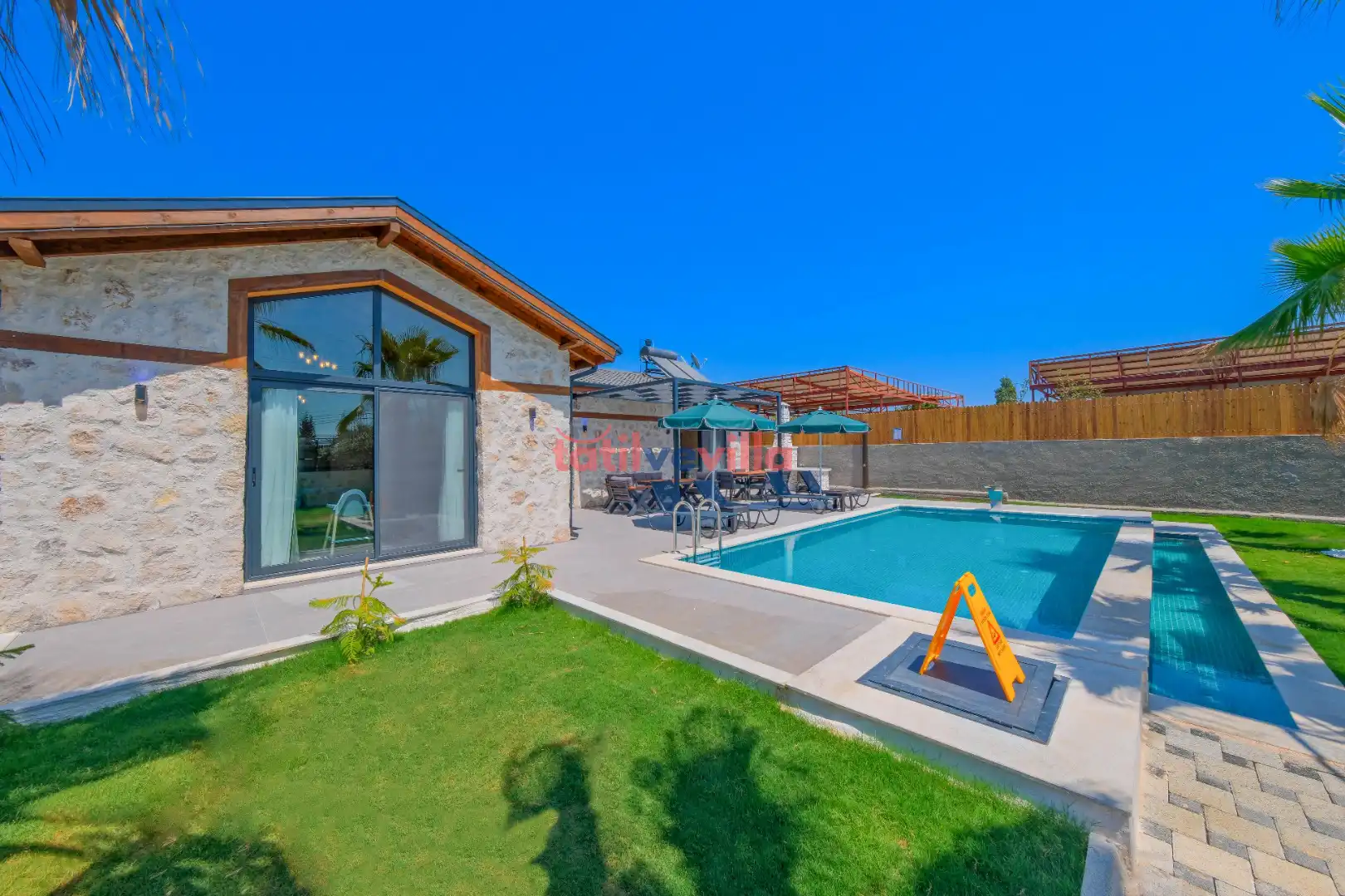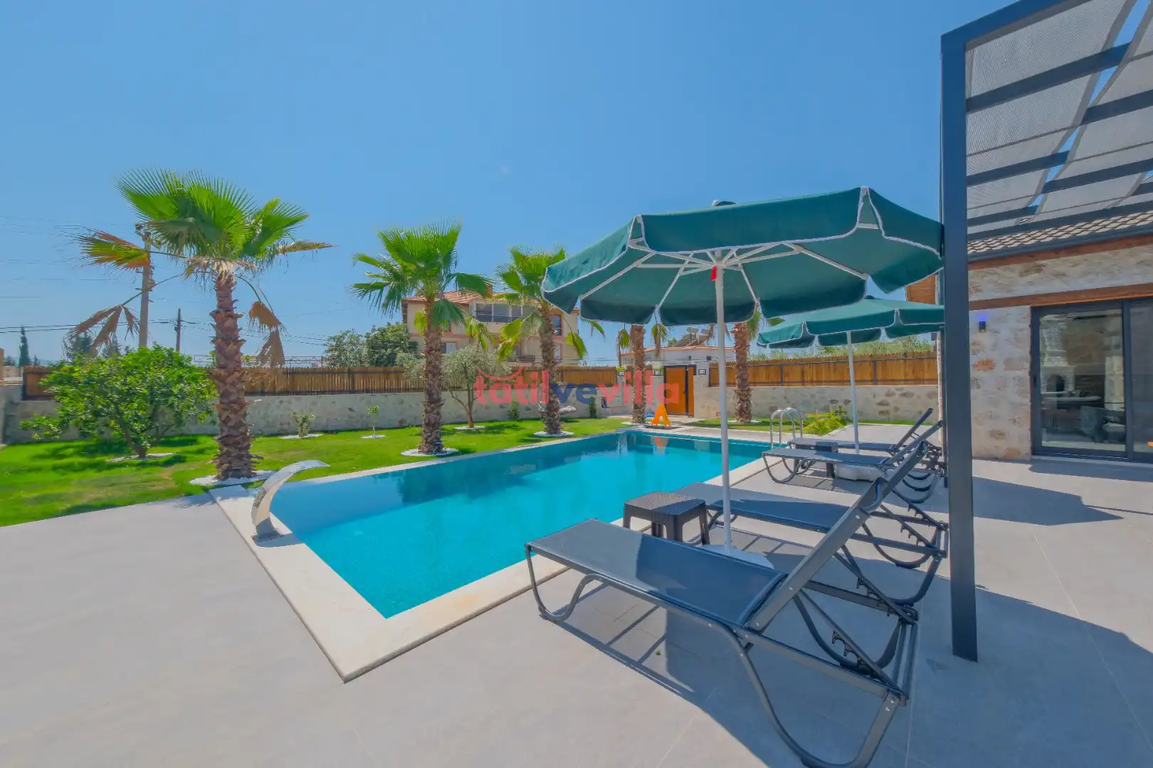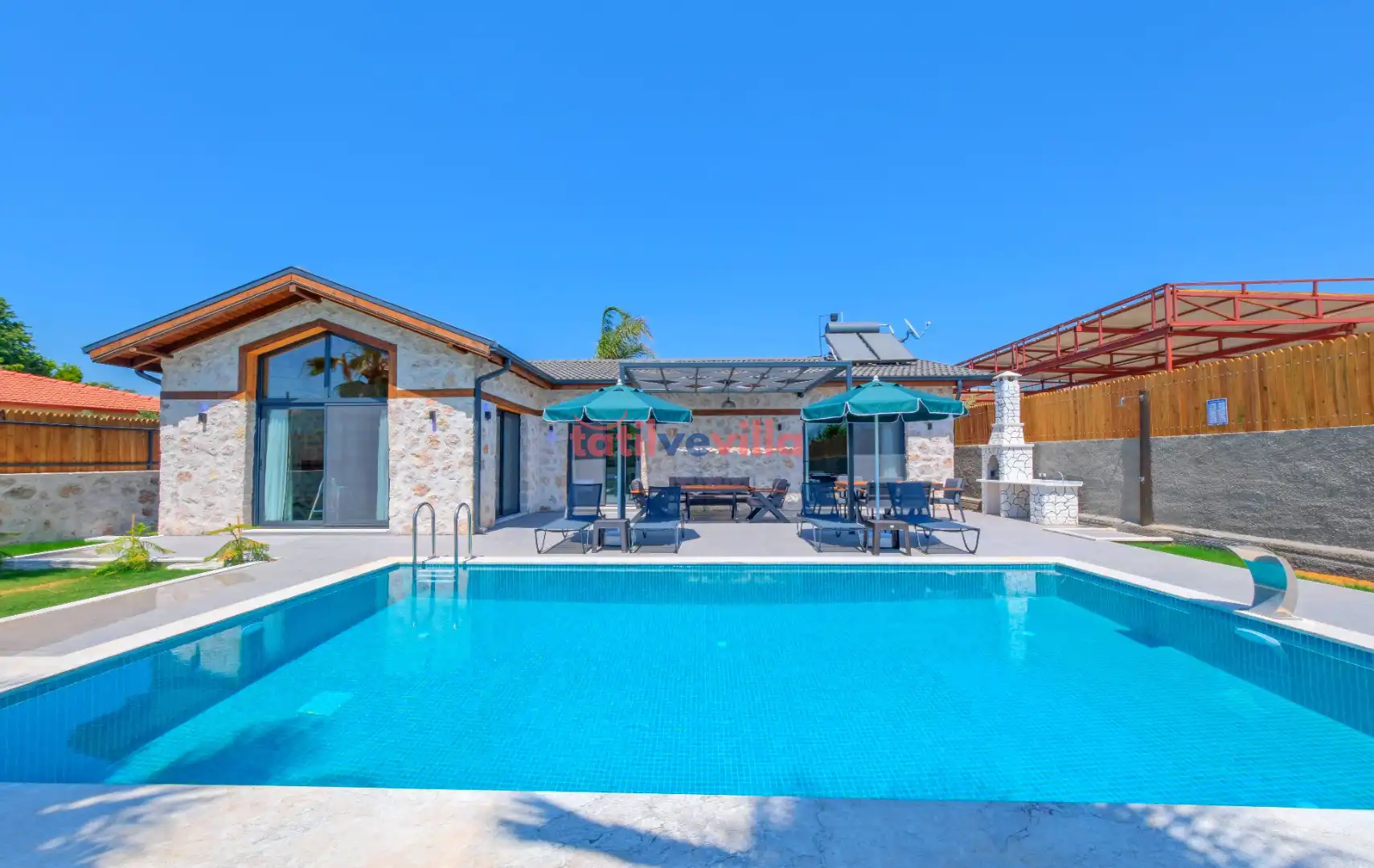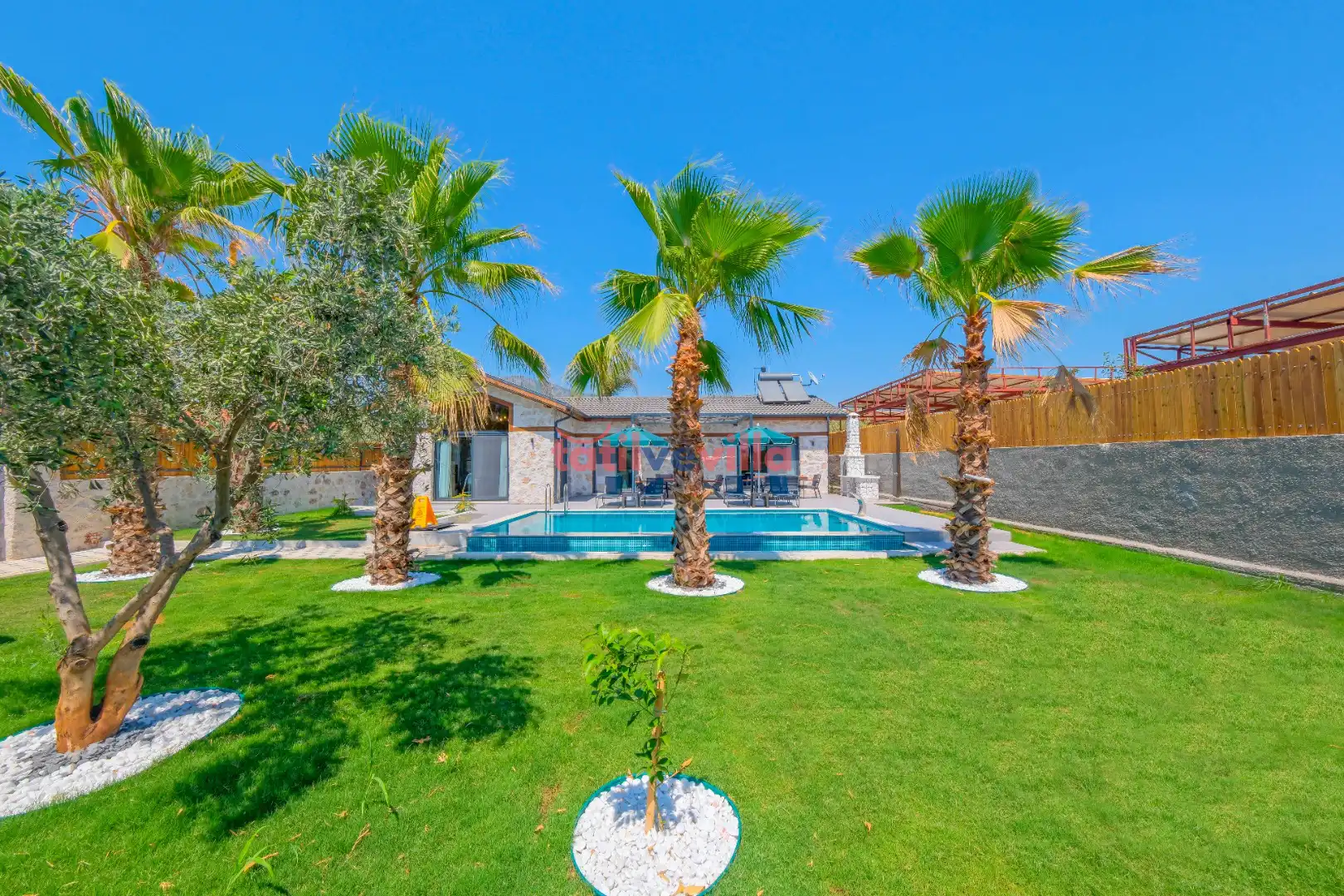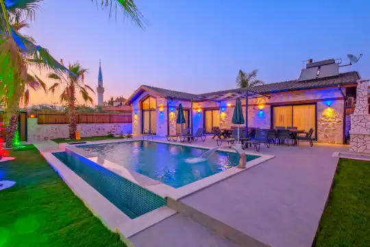 Sakin ve merkezi konumu sayesinde tercihlerin başında gelen villa, oldukça ferah ve geniş bahçe alanında kapasiteye uygun şezlong takımı, oturma grubu ve barbekü alanına sahiptir. Havuz terasına açılan zevkle döşenmiş oturma odası; donanımlı mutfağı, bir yatak odasında çift kişilik yatak, ebeveyn banyosu ve jakuzi; ikinci yatak odasında da iki tek kişilik yatak ve ebeveyn banyosu bulunmaktadır. İç mekan yapısı ve donanımları da en az dış mekan kadar ferah, modern ve konforunuz ön planda tutularak oluşturulmuştur.