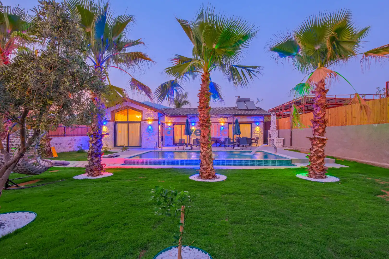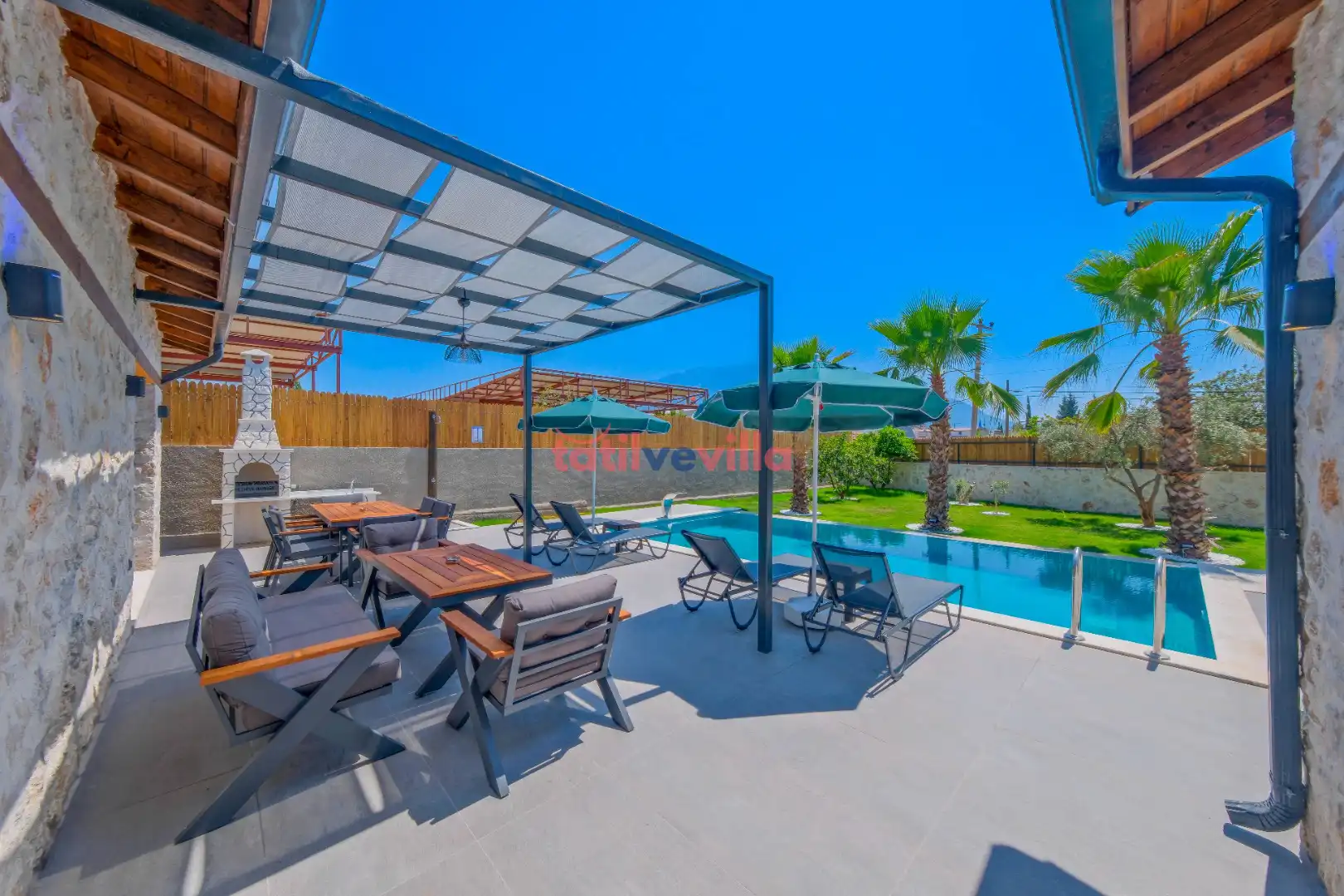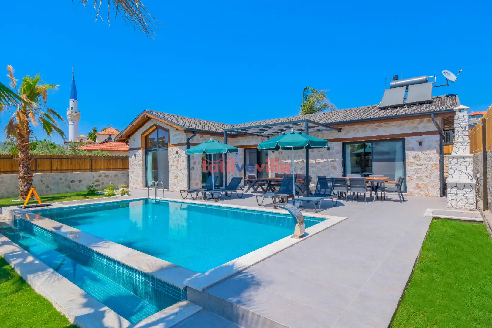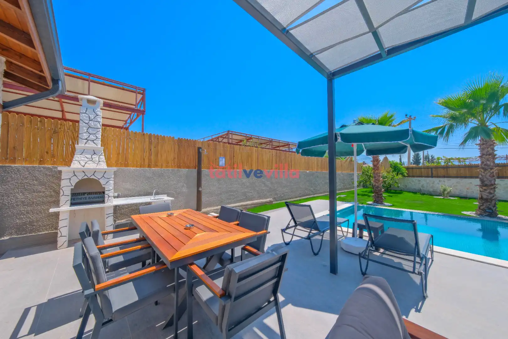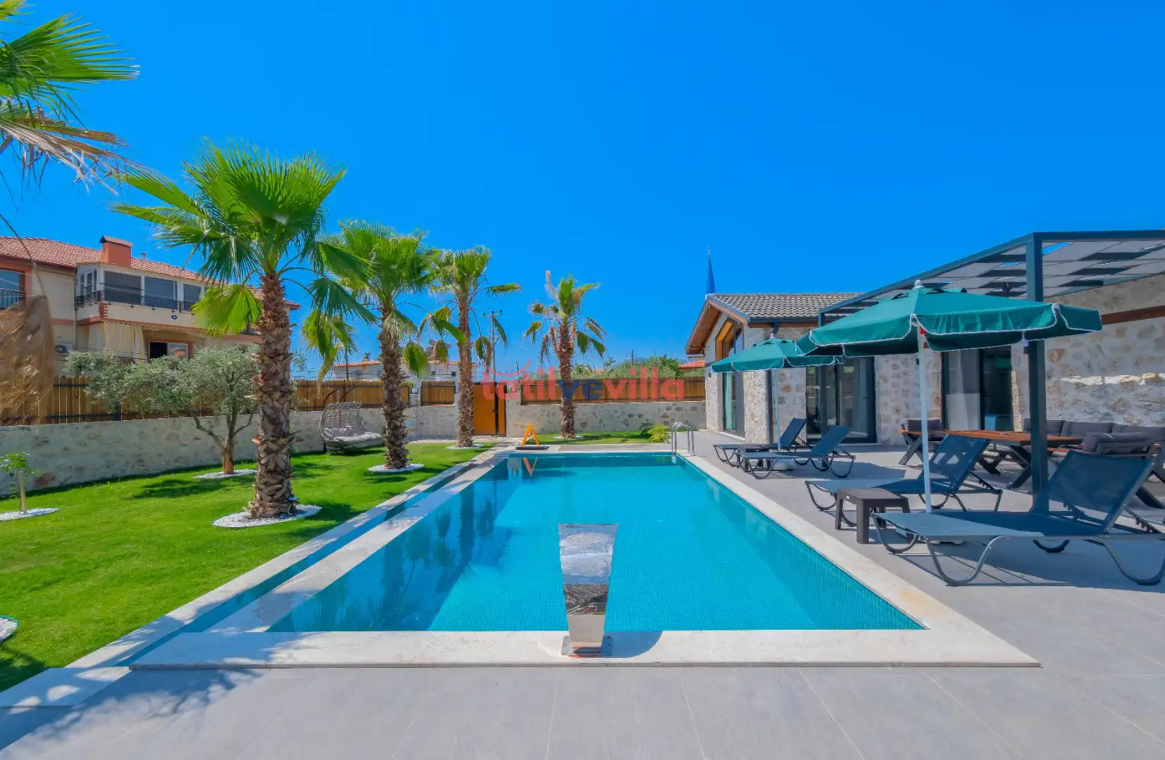 Sakin ve merkezi konumu sayesinde tercihlerin başında gelen villa, oldukça ferah ve geniş bahçe alanında kapasiteye uygun şezlong takımı, oturma grubu ve barbekü alanına sahiptir. Havuz terasına açılan zevkle döşenmiş oturma odası; donanımlı mutfağı, bir yatak odasında çift kişilik yatak, ebeveyn banyosu ve jakuzi; ikinci yatak odasında da iki tek kişilik yatak ve ebeveyn banyosu bulunmaktadır. İç mekan yapısı ve donanımları da en az dış mekan kadar ferah, modern ve konforunuz ön planda tutularak oluşturulmuştur.