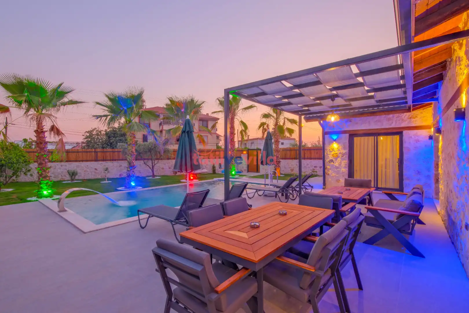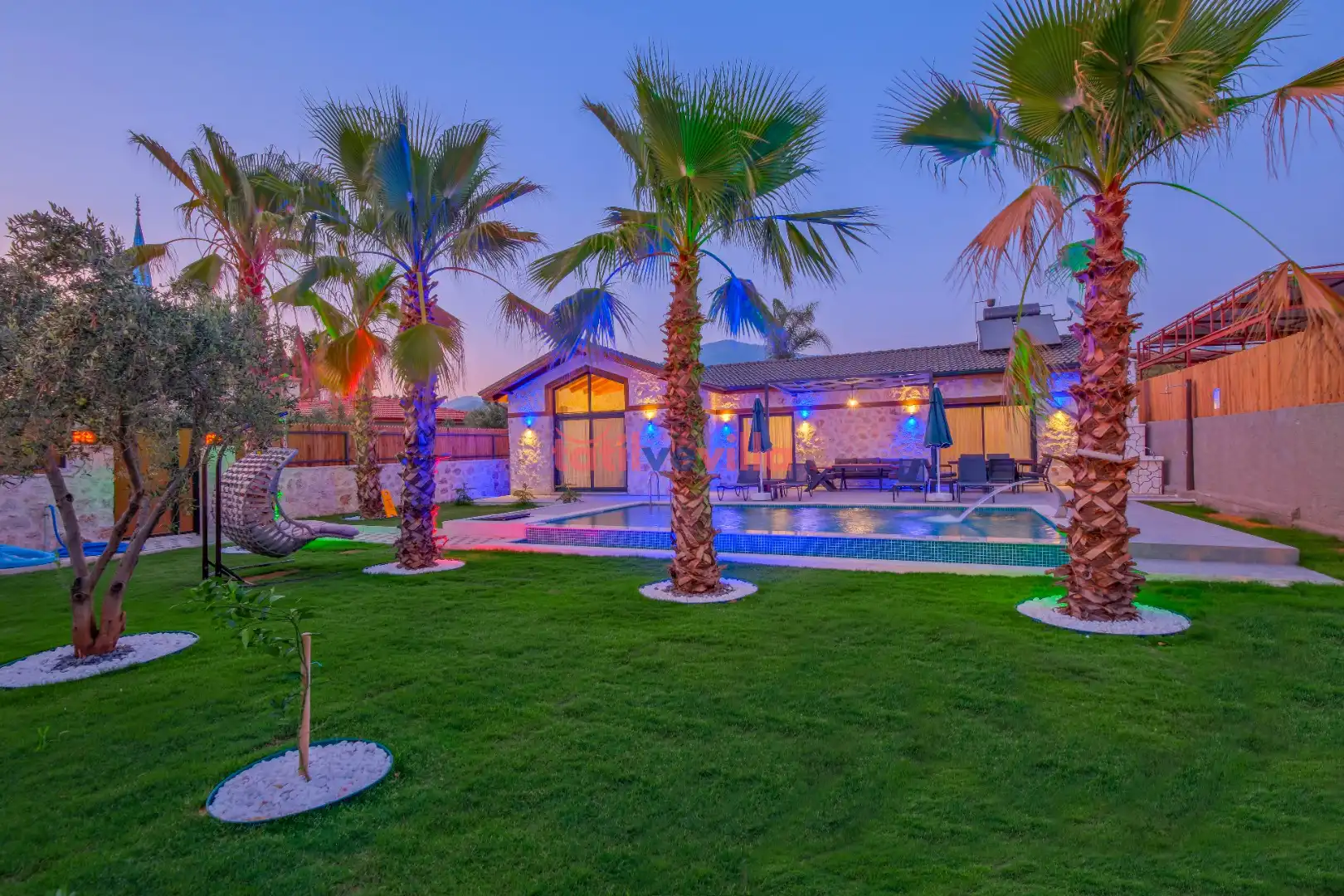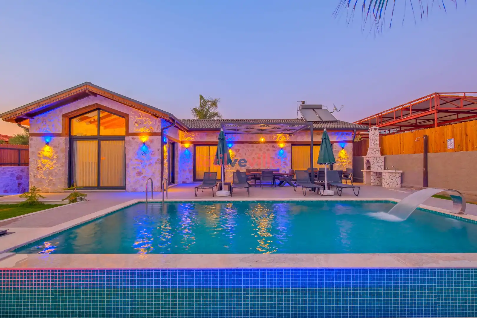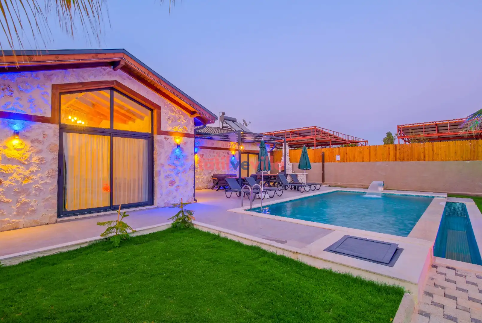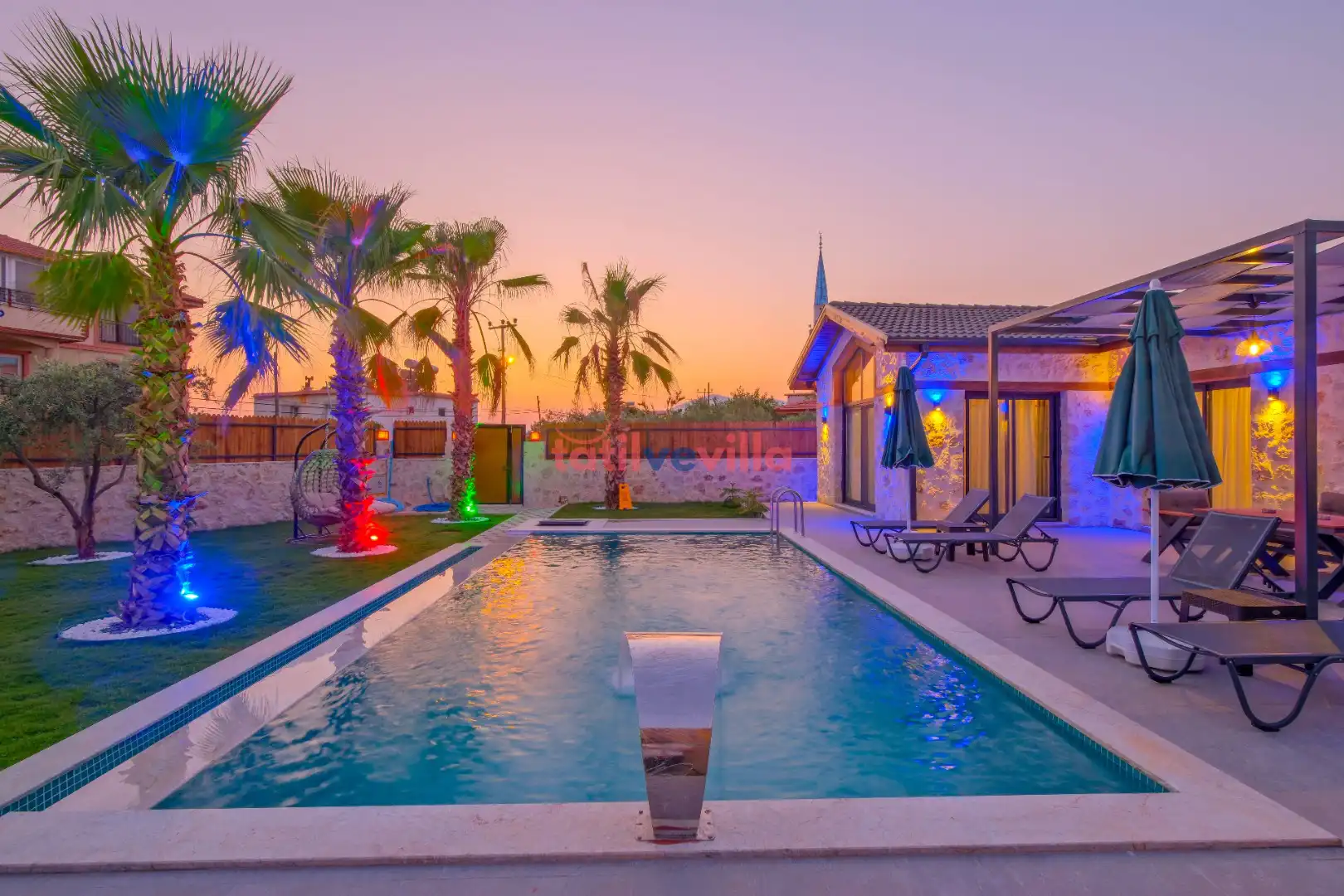 Sakin ve merkezi konumu sayesinde tercihlerin başında gelen villa, oldukça ferah ve geniş bahçe alanında kapasiteye uygun şezlong takımı, oturma grubu ve barbekü alanına sahiptir. Havuz terasına açılan zevkle döşenmiş oturma odası; donanımlı mutfağı, bir yatak odasında çift kişilik yatak, ebeveyn banyosu ve jakuzi; ikinci yatak odasında da iki tek kişilik yatak ve ebeveyn banyosu bulunmaktadır. İç mekan yapısı ve donanımları da en az dış mekan kadar ferah, modern ve konforunuz ön planda tutularak oluşturulmuştur.