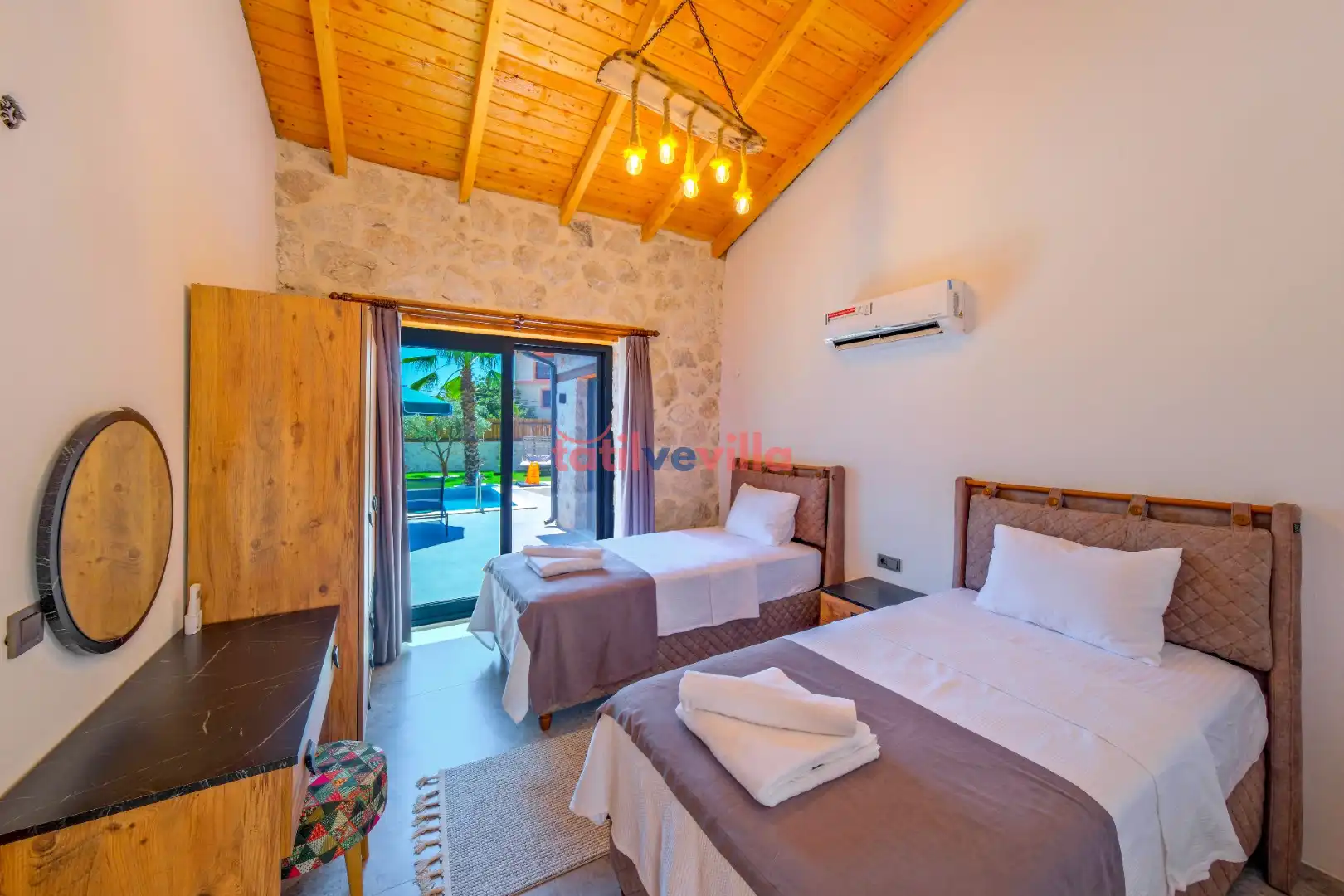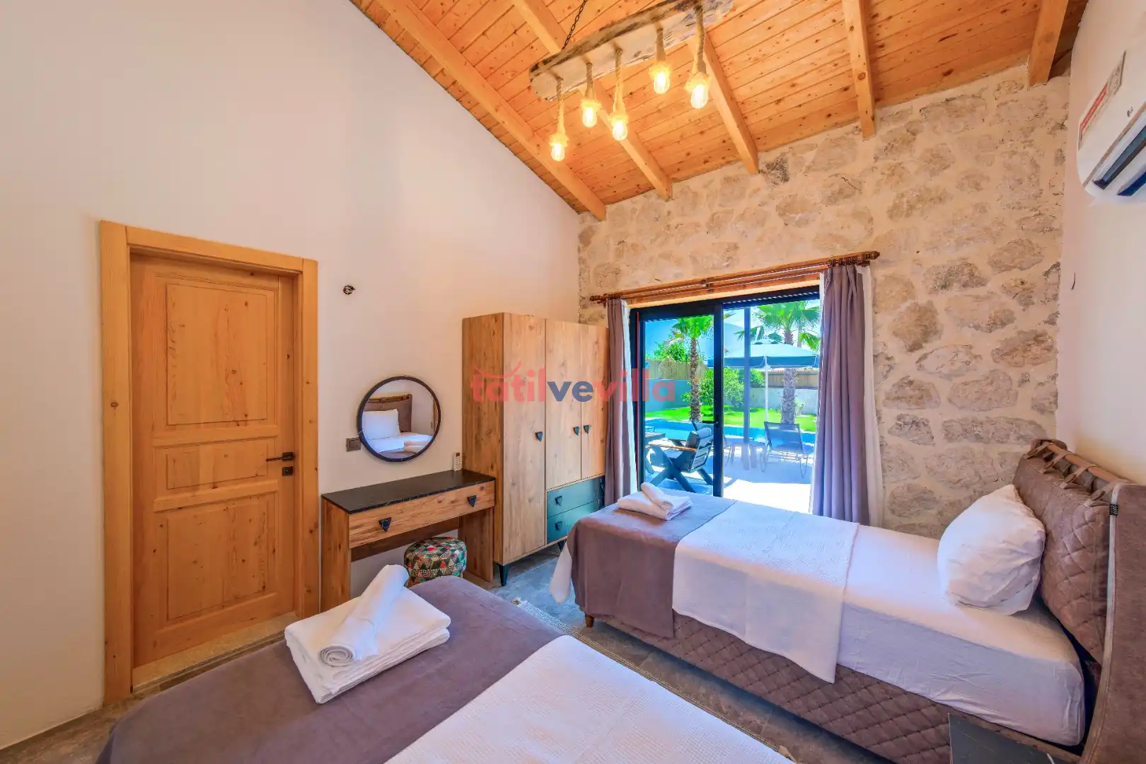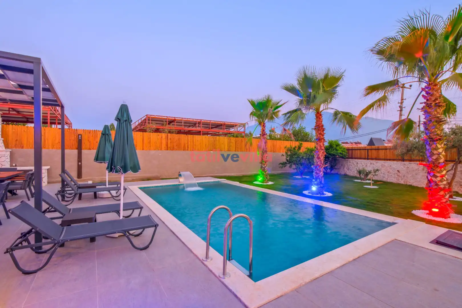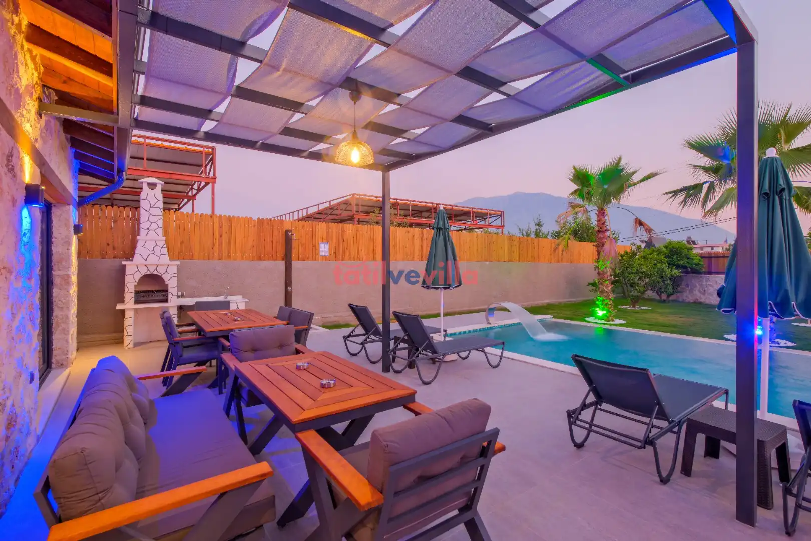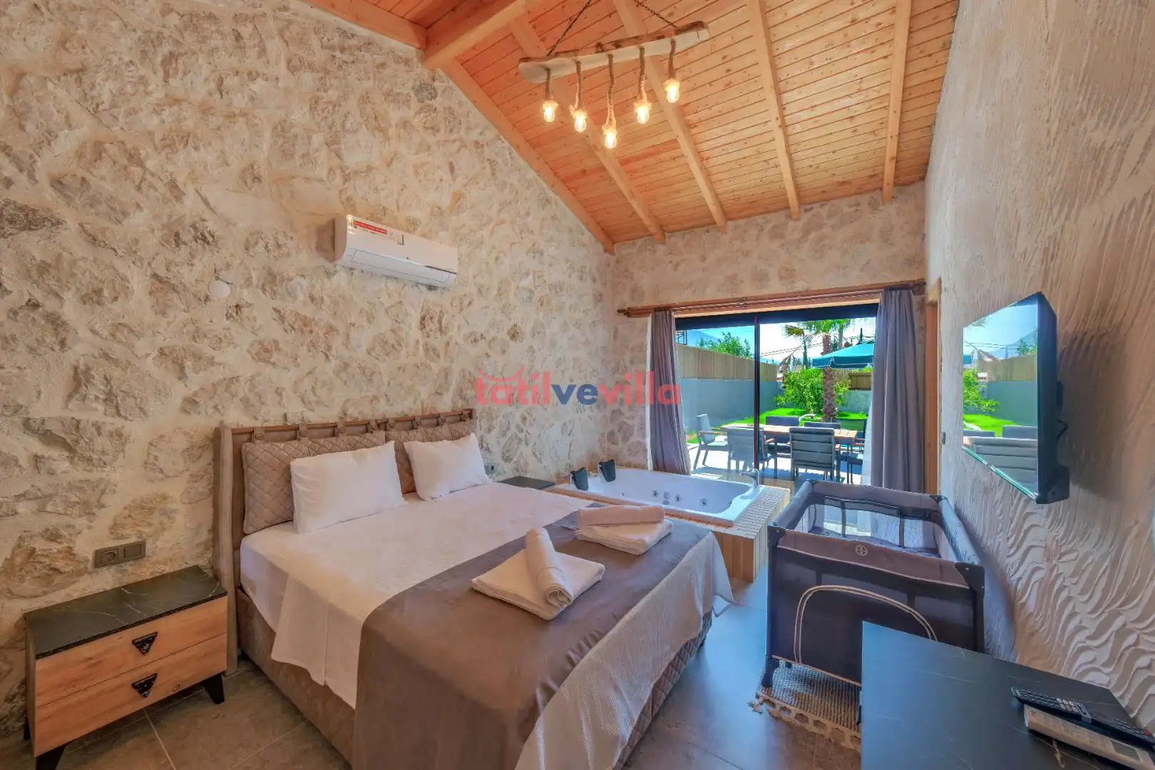 Sakin ve merkezi konumu sayesinde tercihlerin başında gelen villa, oldukça ferah ve geniş bahçe alanında kapasiteye uygun şezlong takımı, oturma grubu ve barbekü alanına sahiptir. Havuz terasına açılan zevkle döşenmiş oturma odası; donanımlı mutfağı, bir yatak odasında çift kişilik yatak, ebeveyn banyosu ve jakuzi; ikinci yatak odasında da iki tek kişilik yatak ve ebeveyn banyosu bulunmaktadır. İç mekan yapısı ve donanımları da en az dış mekan kadar ferah, modern ve konforunuz ön planda tutularak oluşturulmuştur.