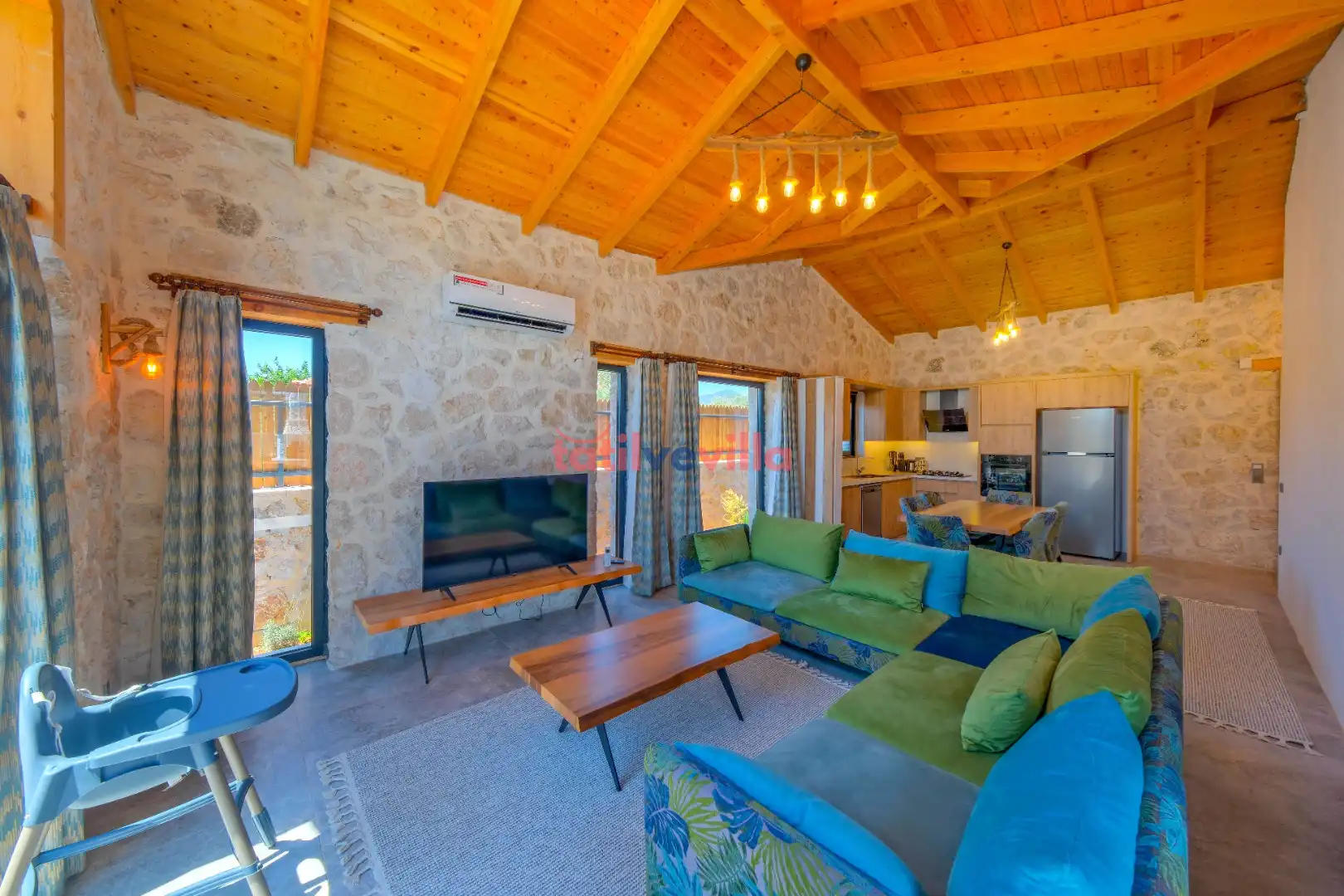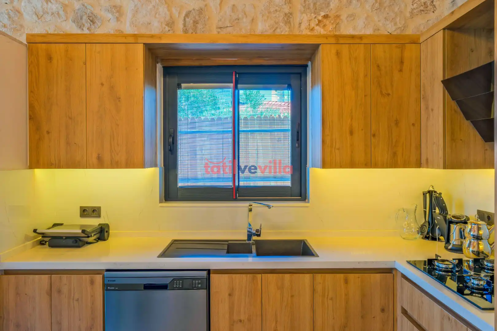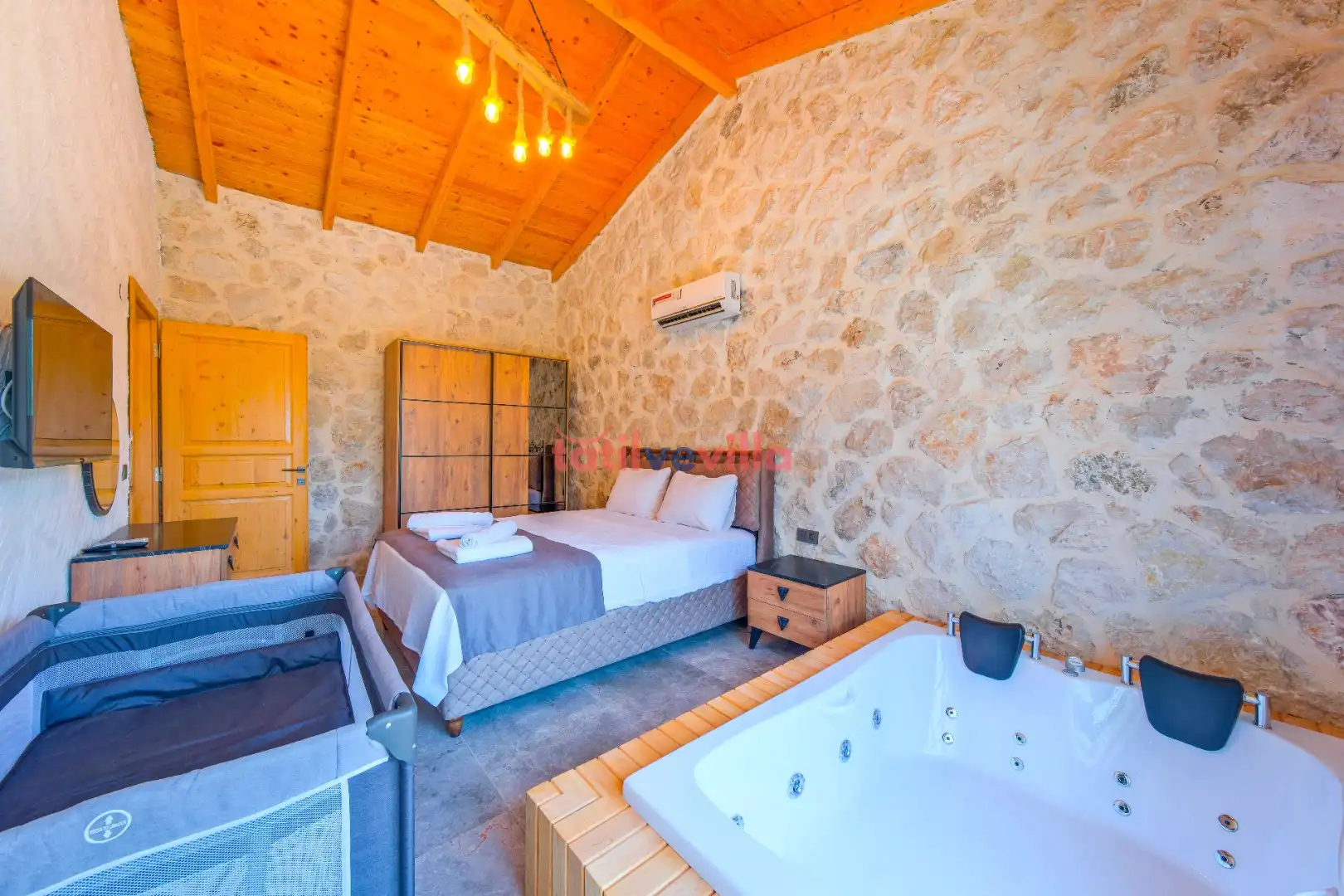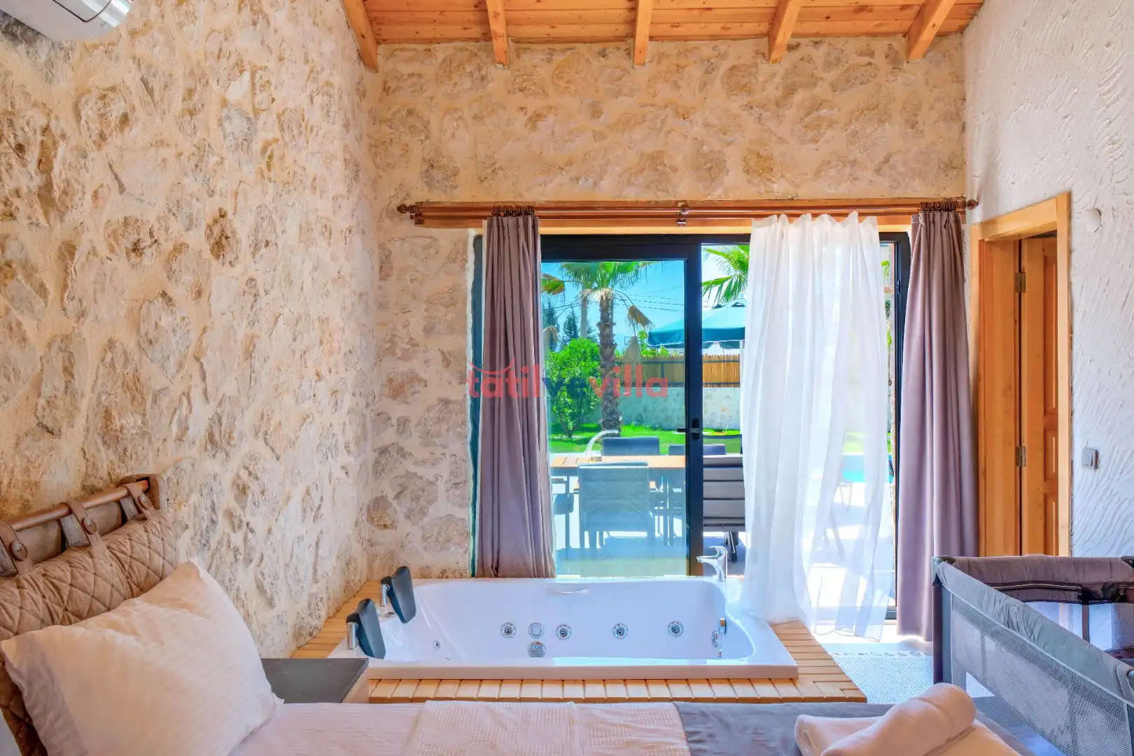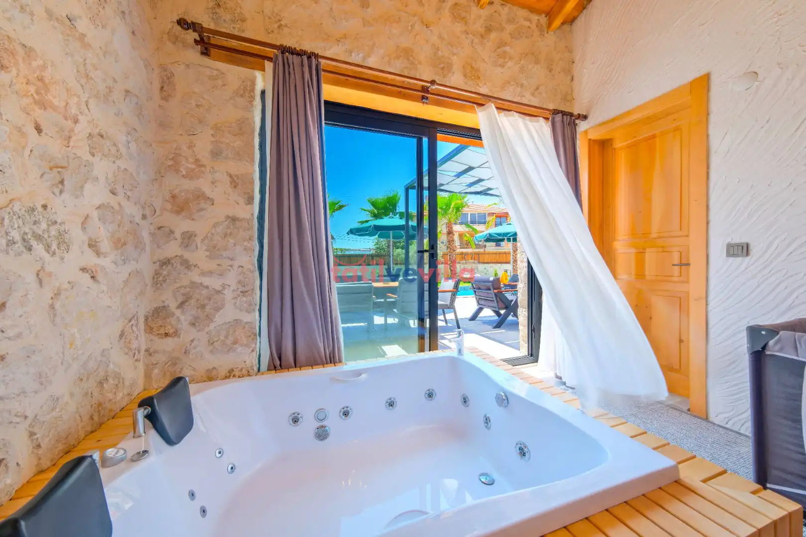 Sakin ve merkezi konumu sayesinde tercihlerin başında gelen villa, oldukça ferah ve geniş bahçe alanında kapasiteye uygun şezlong takımı, oturma grubu ve barbekü alanına sahiptir. Havuz terasına açılan zevkle döşenmiş oturma odası; donanımlı mutfağı, bir yatak odasında çift kişilik yatak, ebeveyn banyosu ve jakuzi; ikinci yatak odasında da iki tek kişilik yatak ve ebeveyn banyosu bulunmaktadır. İç mekan yapısı ve donanımları da en az dış mekan kadar ferah, modern ve konforunuz ön planda tutularak oluşturulmuştur.